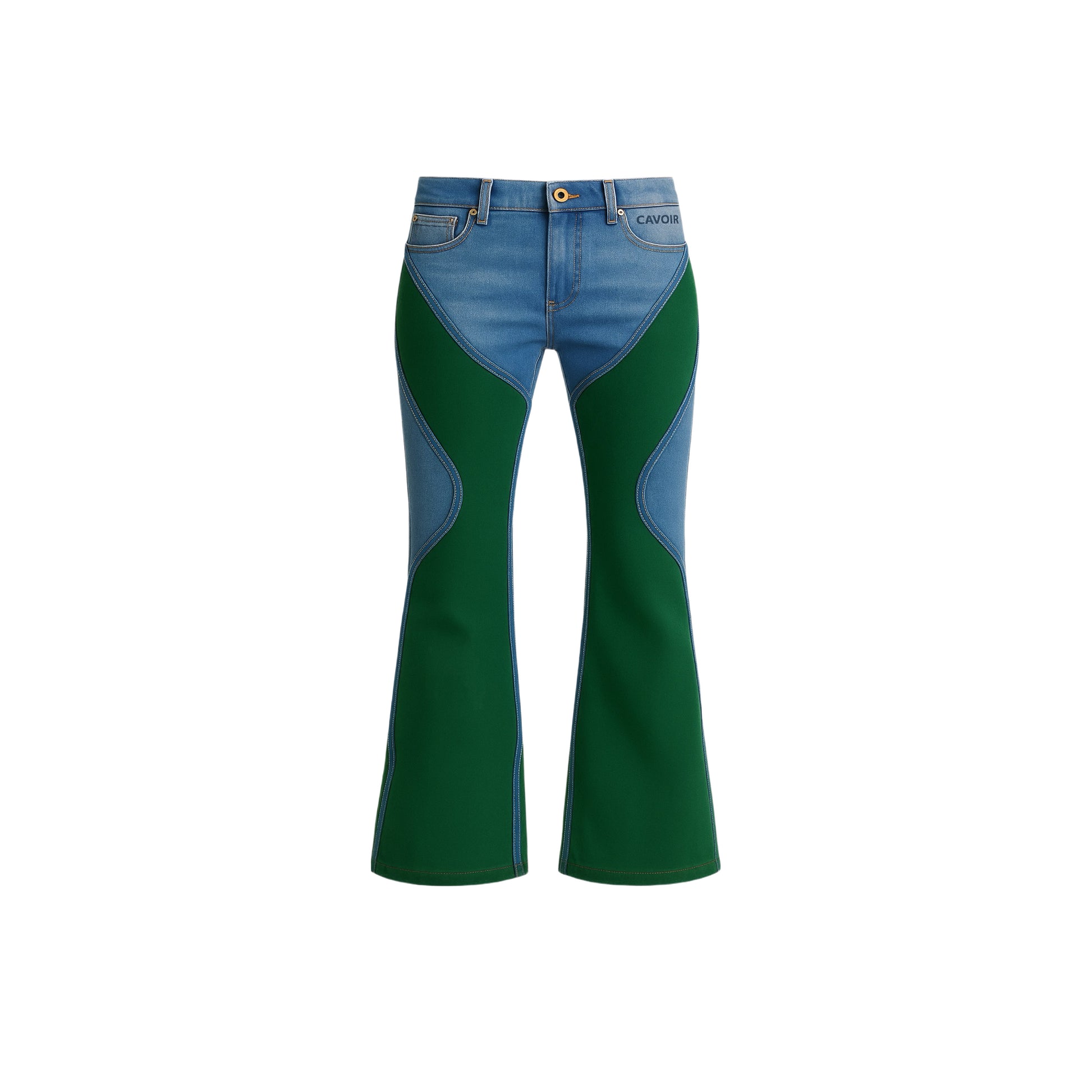 Statement two-tone panel flare with curved lines for a sculpted silhouette. A signature runway-ready piece.