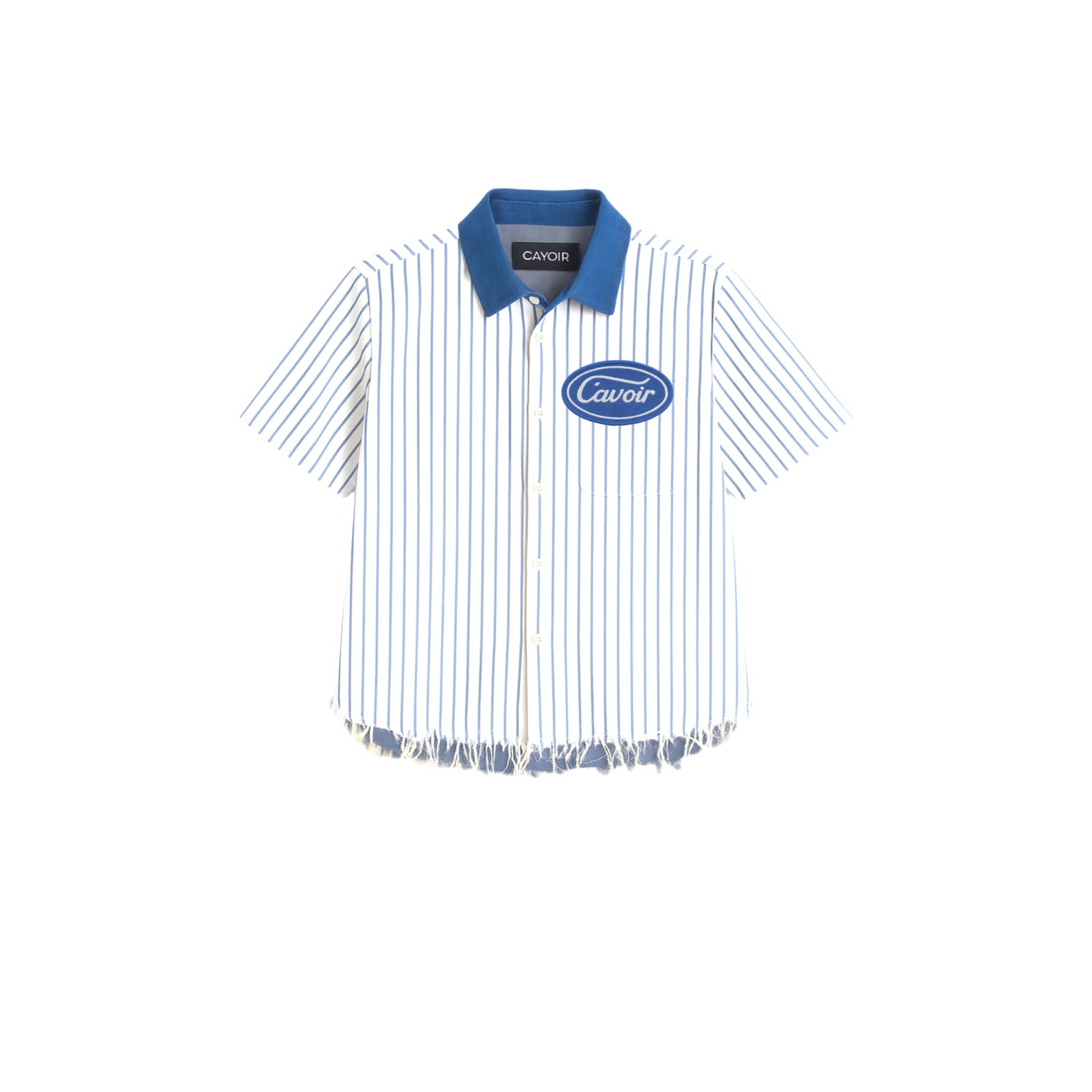 A relaxed-fit shirt crafted in fine viscose, featuring the signature CAVOIR oval logo and blue contrast collar. The frayed hem adds modern texture to a retro-inspired silhouette.